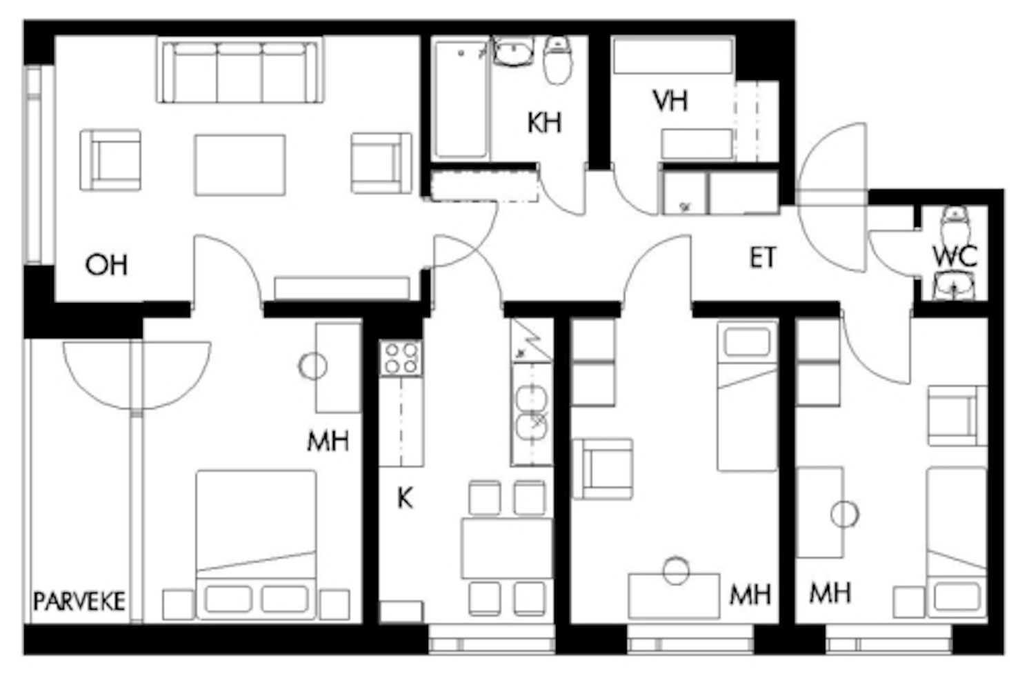 | Huoneiden lukumäärä: | 4h+k+vh+1wc+kph, parveke |